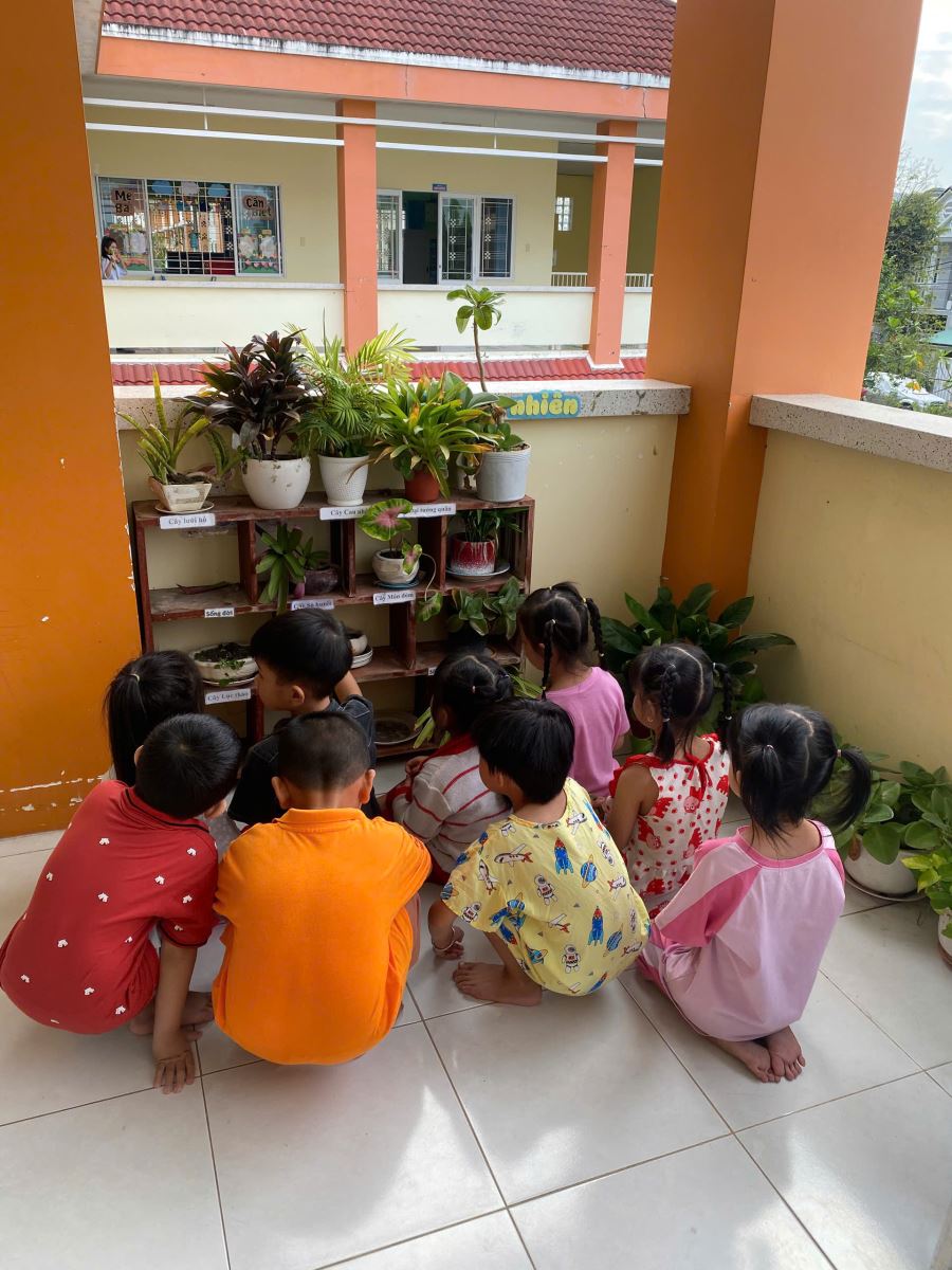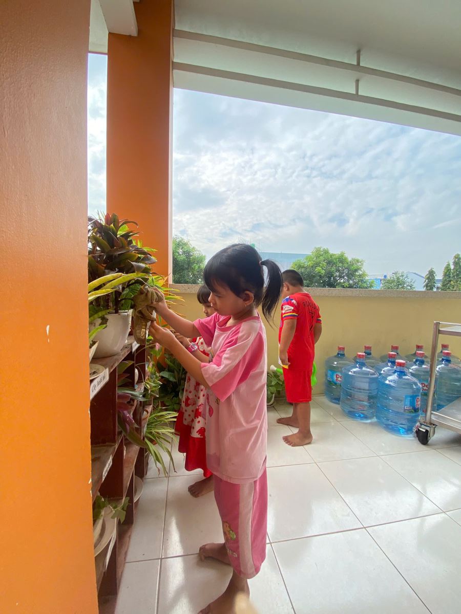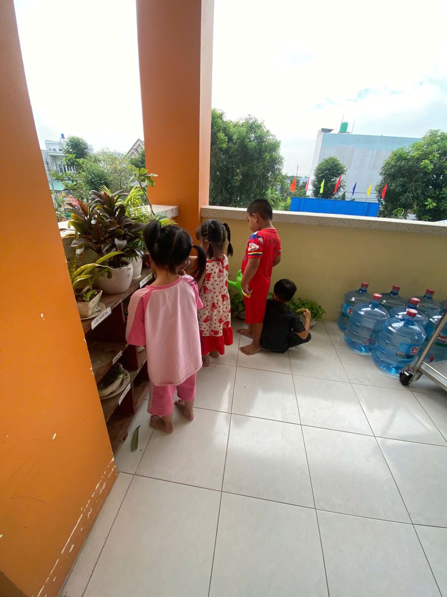 Các bé lớp lá 2 chăm sóc góc thiên nhiên của lớp