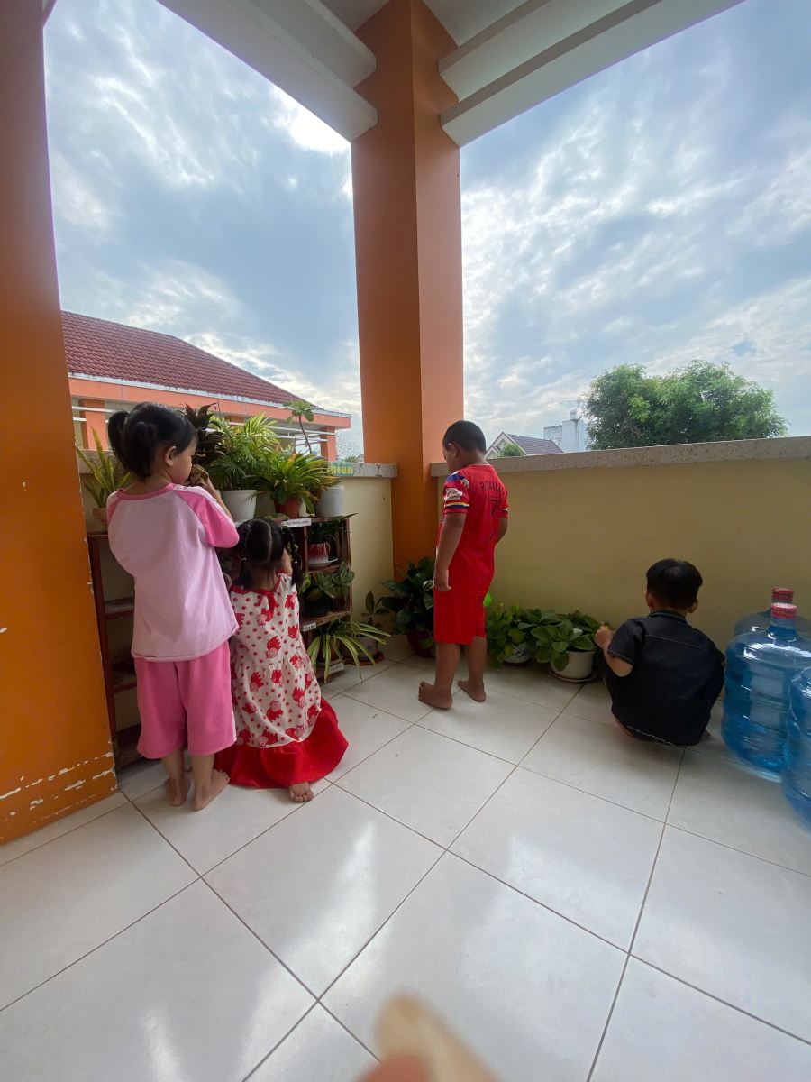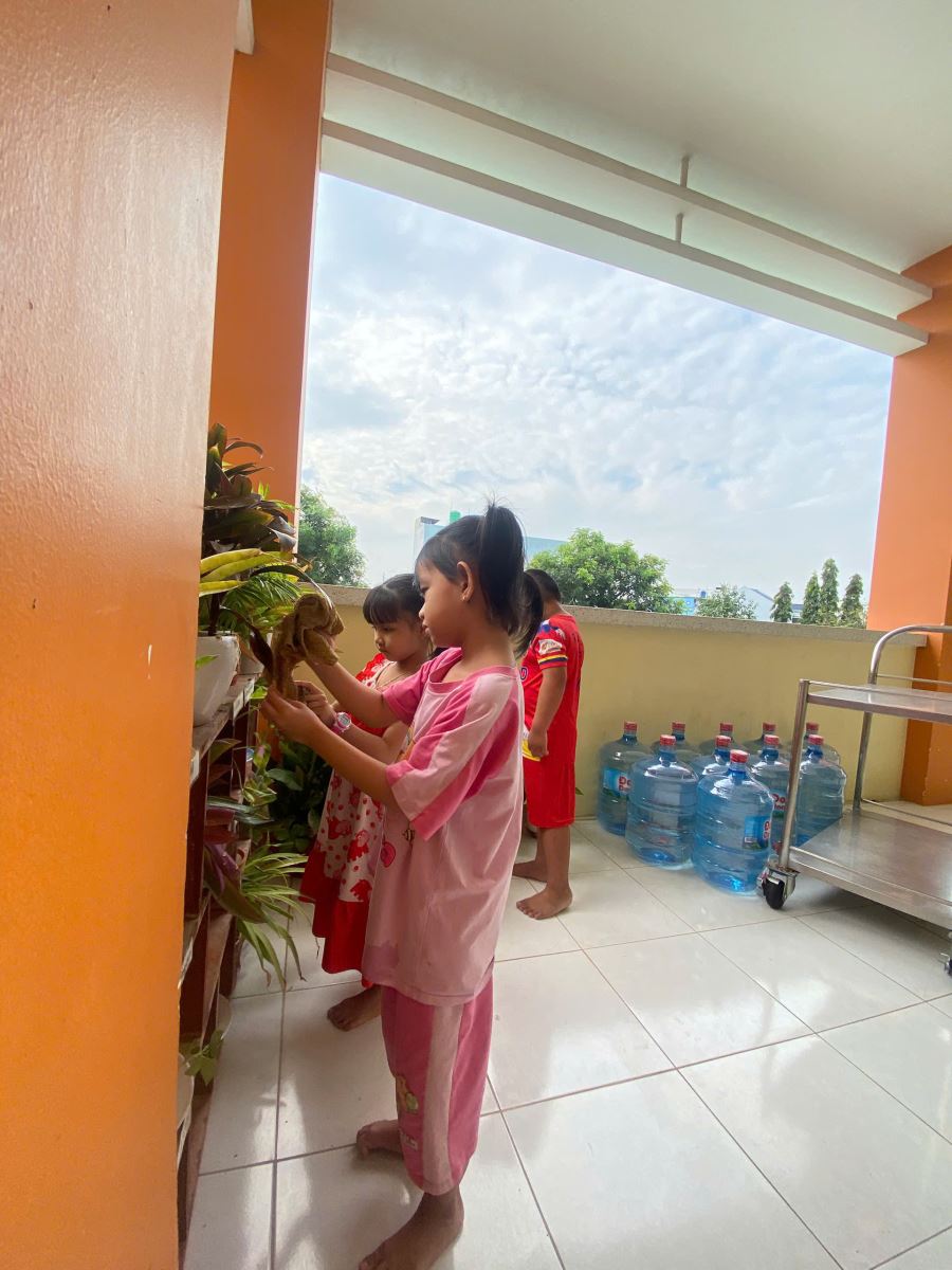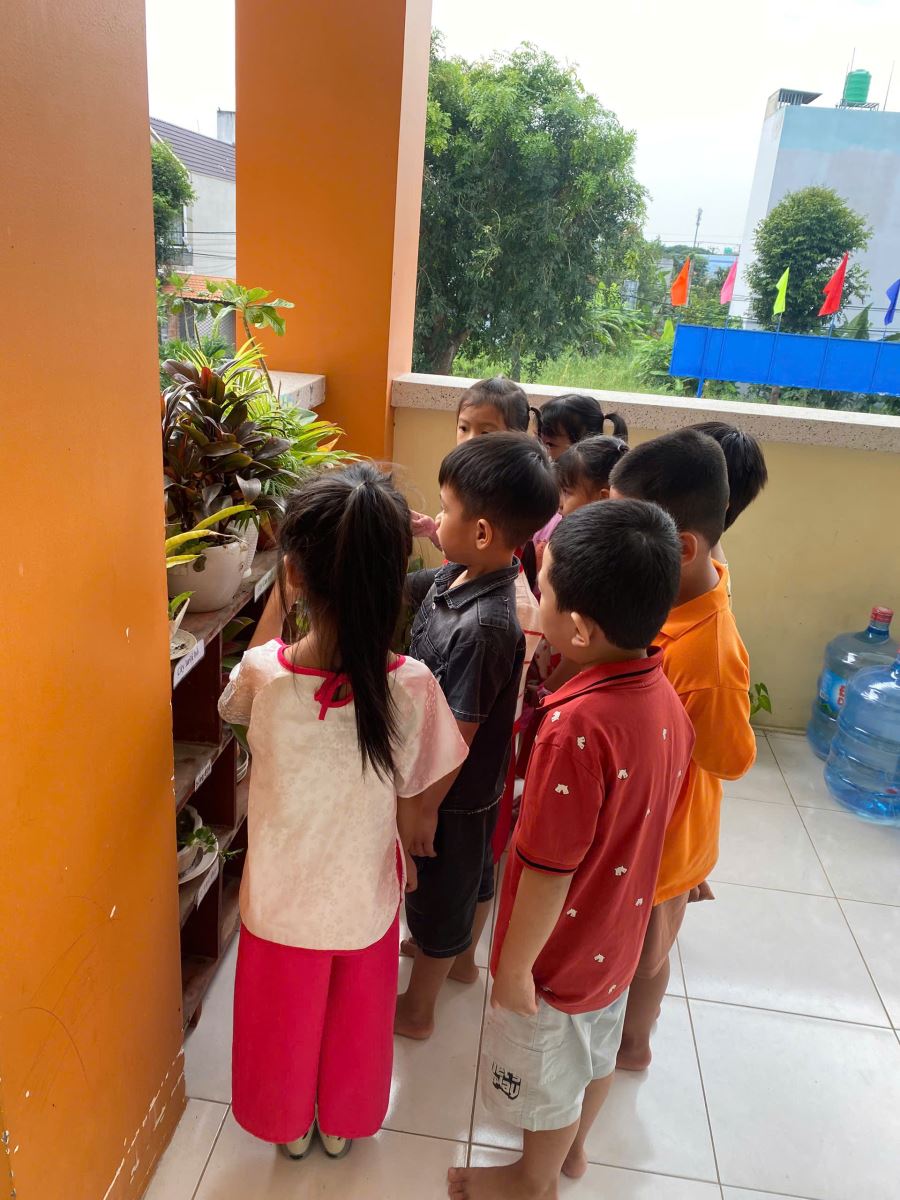 Các bé lớp lá 2 chăm sóc góc thiên nhiên của lớp
